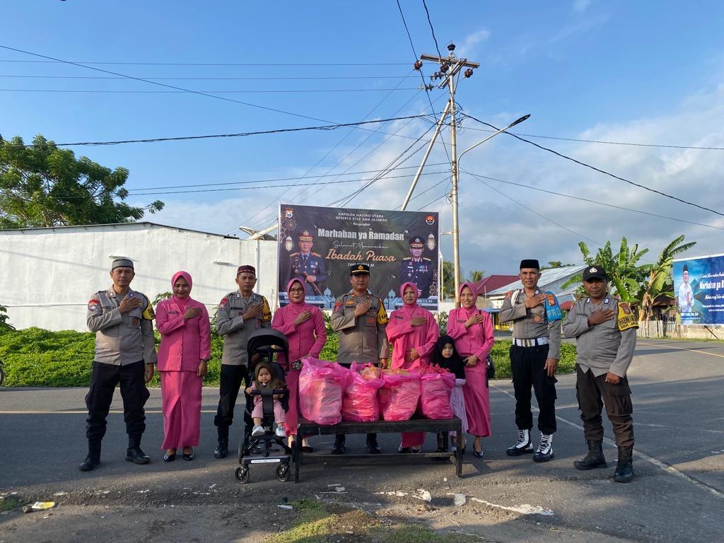 PORDES JAILOLO – Kapolsek Jailolo Selatan IPTU Sunarto, dan anggota Polsek Jailolo Selatan didampingi Ketua Bhayangkari Ranting Jailolo Selatan Ny. Nursamsi Sunarto Beserta Pengurus Bhayangkari Ranting Jailolo Selatan menggelar pembagian takjil ke masyarakat. Kegiatan tersebut dilaksanakan di Kecamatan Jailolo Selatan dengan sasaran pengendara sepeda motor dan pejalan kaki.