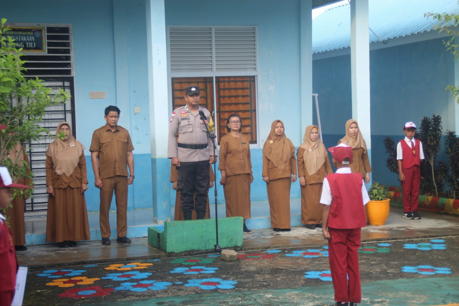 PORDES KEPRI – Bhabinkamtibmas Kelurahan Sungai Enam Kecamatan Bintan Timur Polres Bintan Brigadir Ferli Ernando menjadi Inspektur Upacara di Sekolah Dasar Negeri 016 Bintan Timur di Sungai Enam Darat RT 001 RW 003 Kelurahan Sungai Enam, Senin pagi 4 Maret 2024.