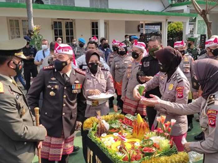 Dari gerbang Makorem 061 Suryakencana, potongan kue tumpeng didorong rombongan polisi. Mereka menabuh gendang sembari menyanyikan ucapan ulang tahun.