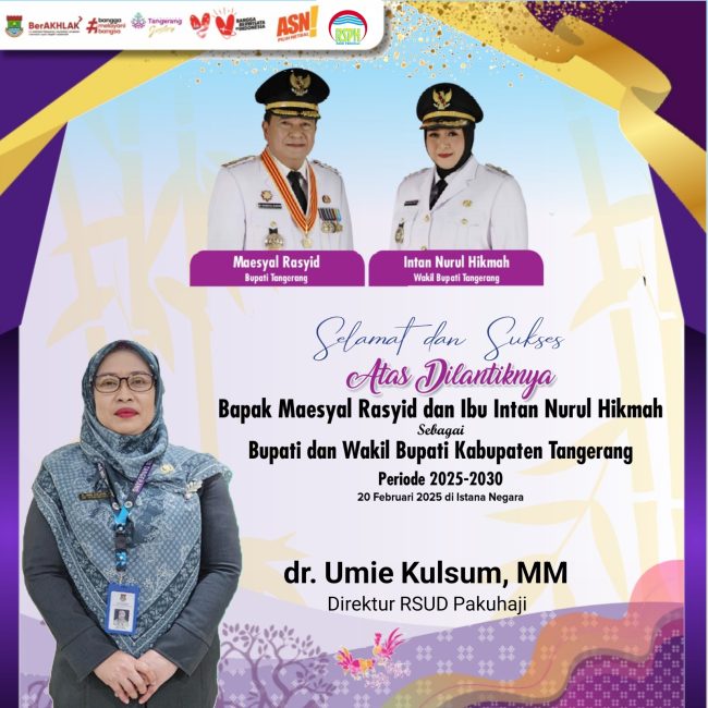 Direktur RSUD Pakuhaji dr. Umie Kulsum mengucapkan Selamat dan Sukses atas dilantiknya Bpk Moch Maesyal Rasyid, dan Ibu Intan Nurul Hikmah sebagai Bupati dan Wakil Tangerang periode 2025-2030.