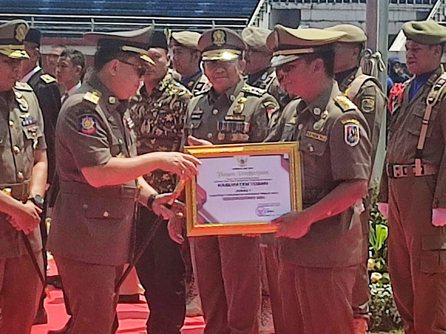 Kepala Satuan Polisi Pamong Praja dan Pemadam Kebakaran Tuban, Gunadi mewakili Bupati Tuban Aditya Halindra Faridzky menerima langsung piagam penghargaan dari Penjabat Gubernur Jawa Timur, Adhi Karyono dalam acara Upacara Gelar Pasukan di Stadion Jember Sport Garden pada Rabu 6 Maret 2024.