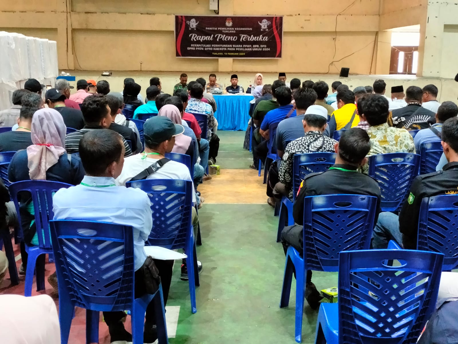 PORDES RIAU – Panitia pemilihan umum (Pemilu) 2024 tingkat Kecamatan Tualang menggelar rapat pleno terbuka rekapitulasi hasil penghitungan suara Pemilu tahun 2024 tingkat Kecamatan Tualang Kabupaten Siak, di gudang logistik PPK Kecamatan Tualang (GOR Tualang), Minggu 18 Februari 2024.